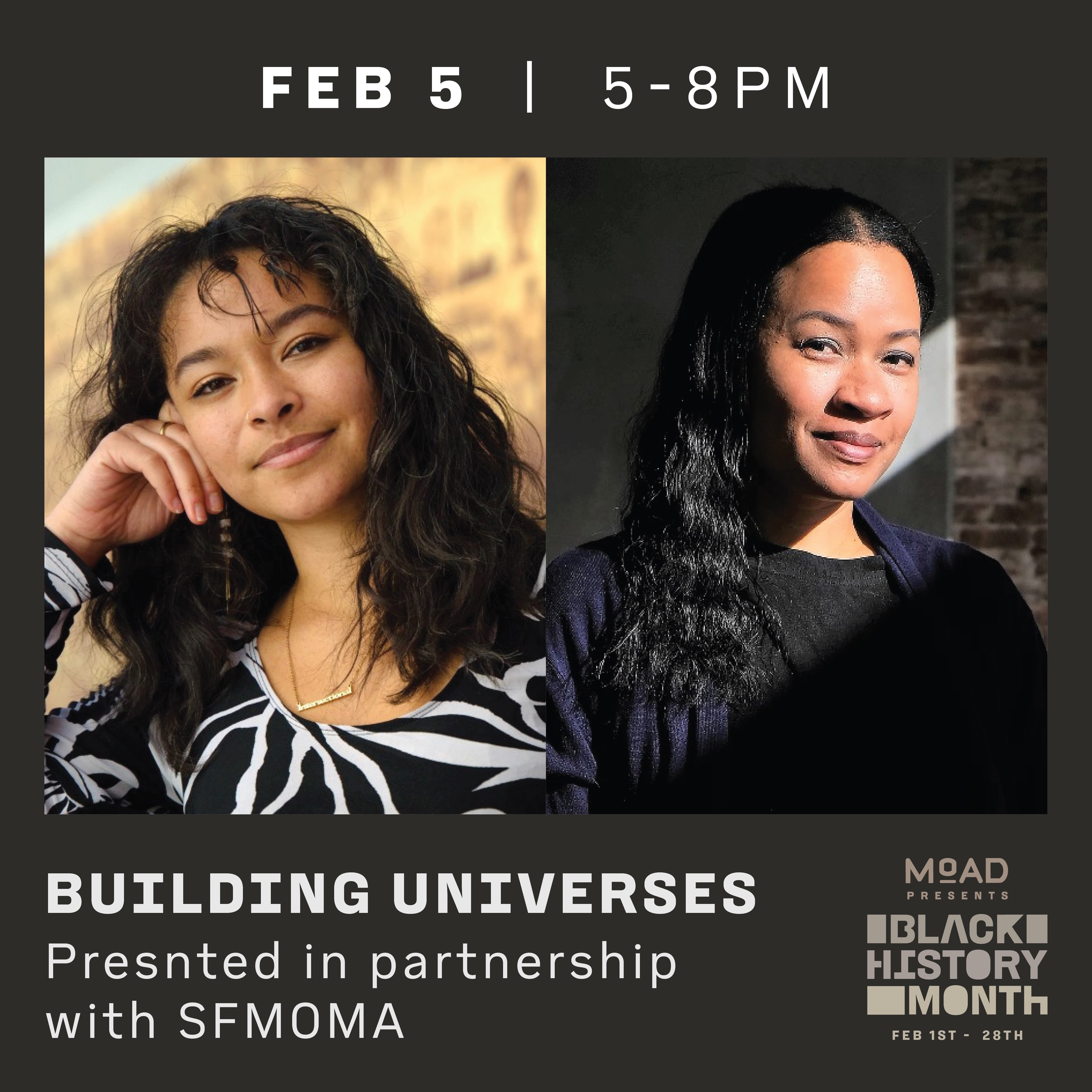 Unique performances with poets and dancers will take place at MoAD and SFMOMA, each repeated giving you the opportunity to see one performance at each institution. Catch the first performance at MoAD and then head over to SFMOMA for the second performance, or start at SFMOMA for their first performance and find your way to MoAD for the second performance.